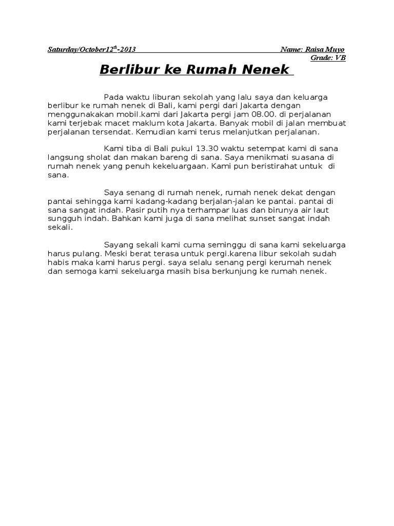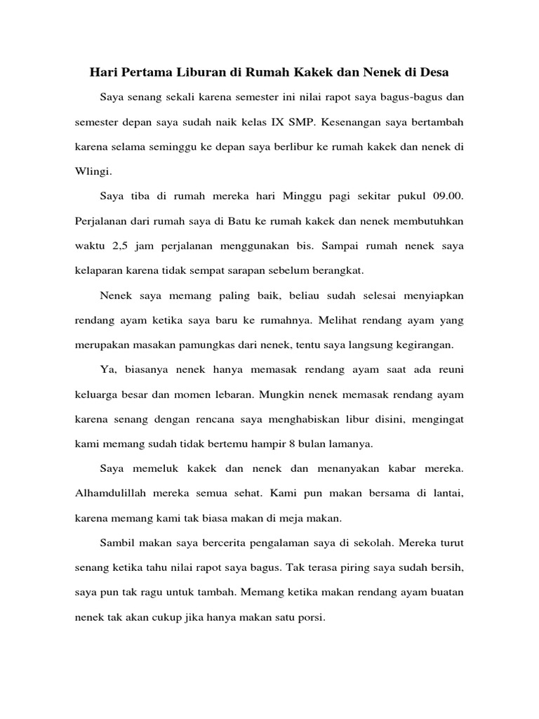 Contoh karangan siswa tentang libur. Admin blog berbagai teks penting 2019 juga mengumpulkan gambar gambar lainnya terkait contoh teks recount liburan ke rumah nenek dibawah ini. Pagi yang cerah aku dan keluarga bersiap siap untuk pergi ke rumah nenek yang berada di kalimantan tengah.